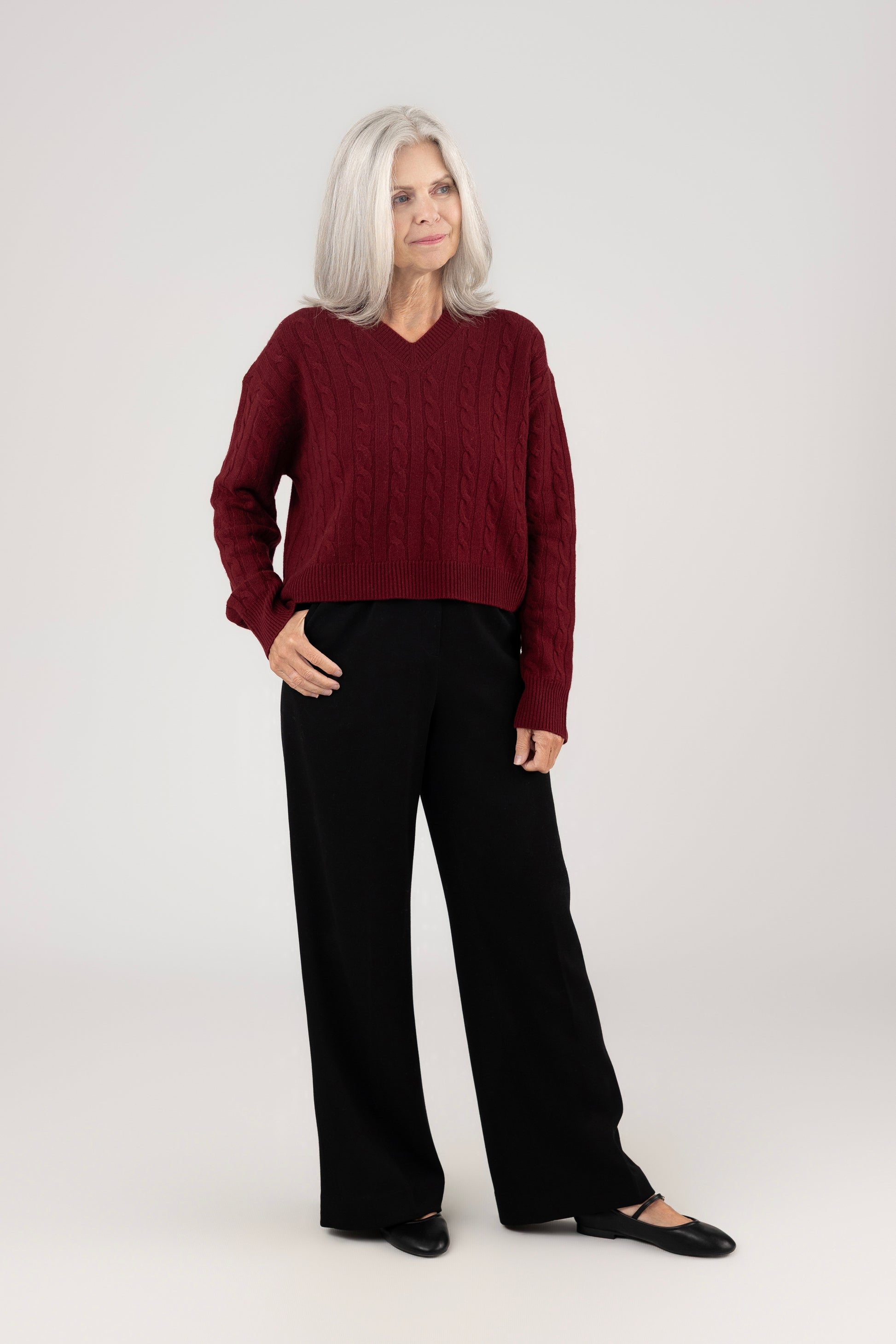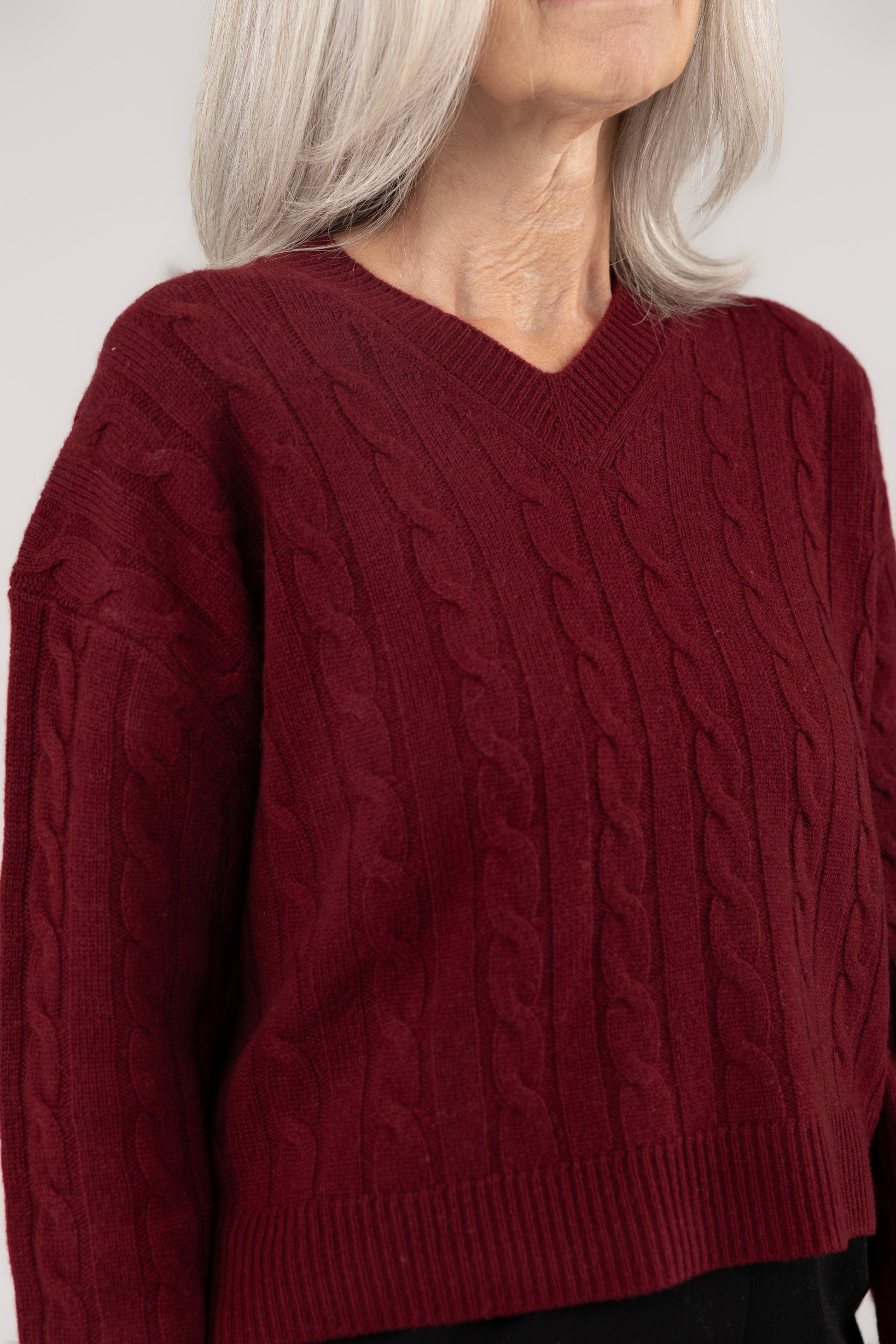Soft, textured, and naturally warm — the V-Neck Cable Pullover is designed with long, oversized sleeves and a slightly shorter body length, creating a playful balance that feels feminine and youthful. The classic cable knit adds depth and character, while the relaxed proportions bring a modern twist to a timeless design.
